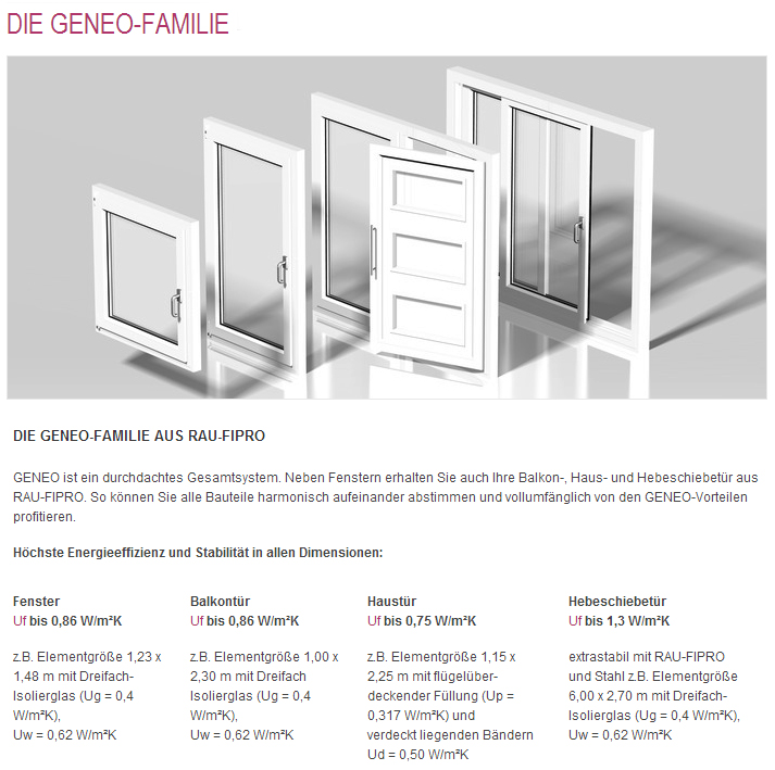 Das GENEO Hebeschiebetürsystem ist die konsequente Erweiterung der innovativen GENEO-Systemfamilie. Dank des Hightech-Werkstoffs RAU-FIPRO erzielen die GENEO Hebeschiebetüren höchste Profilstabilität und hervorragende Wärmedämmwerte.